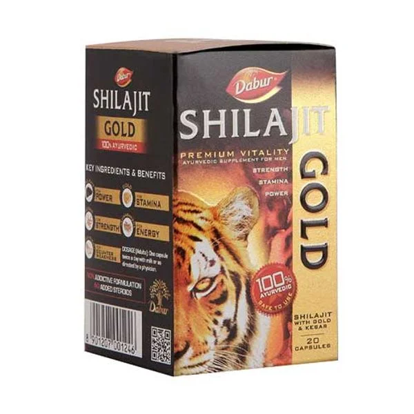 Dabur Shilajit Capsules: Dabur Shilajit Gold is a unique combination of Shilajit, Gold, Kesar and other important herbs like Ashwagandha , Kaunch Beej and Safed Musali. Shilajit Gold is good for general health and helps increase strength, stamina and vigor.